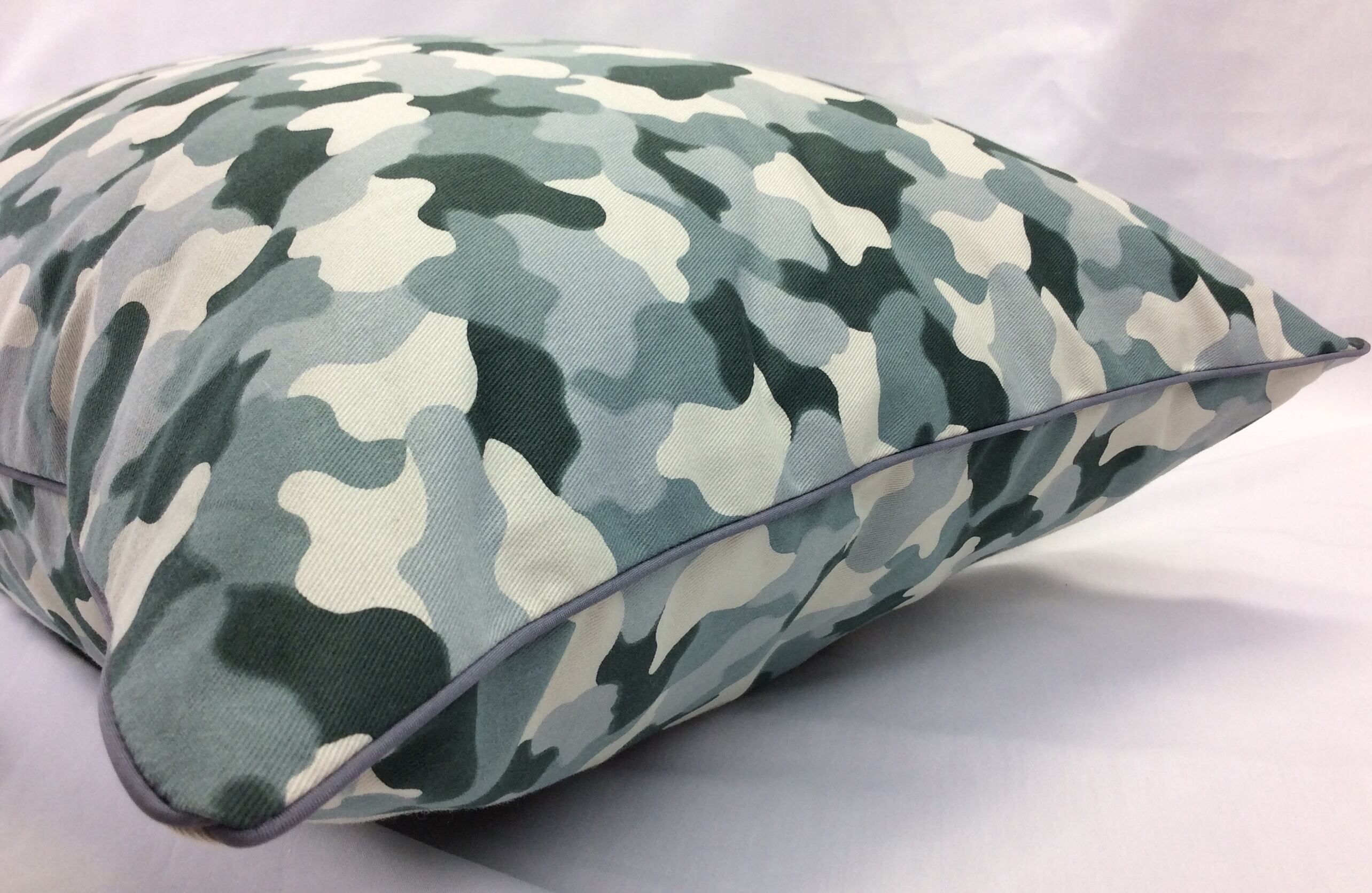 おしゃれでシックな迷彩柄のモチーフのプリント柄、周りにパイピングでアクセントを付けました。生地、裁断、縫製全て国内にての日本製です。生地は厚手のツイルの生地を使っています。